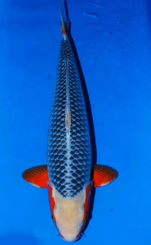 特点:背部呈深蓝色或浅蓝色,一片一片的鱼鳞外缘呈白色,左右睑部、腹部以及各鳍基部呈赤色的锦鲤。